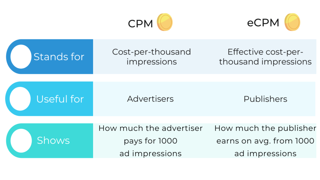 While both CPM and eCPM deal with the cost or value of 1,000 impressions, they speak to opposite sides of the advertising ecosystem: